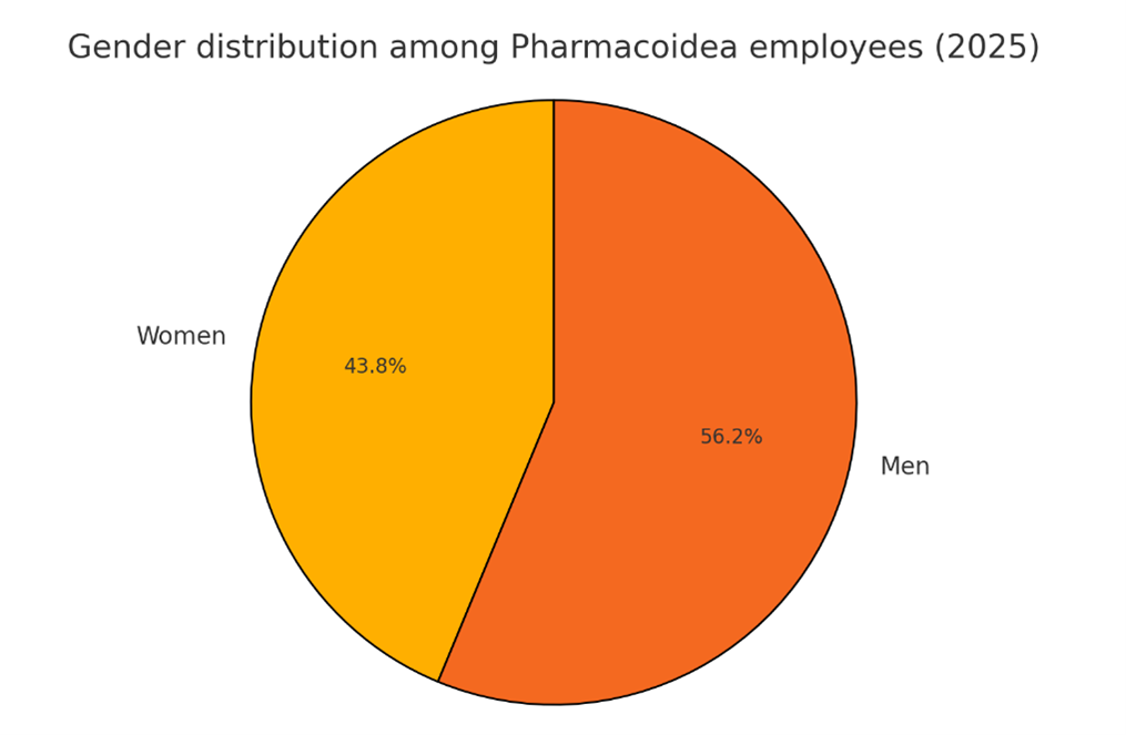 As of 2025, Pharmacoidea employs 16 staff members, of whom 7 are women (44%) and 9 are men (56%). At the management level, there are 3 executives: 2 women (67%) and 1 man (33%), reflecting a notably high representation of women in leadership positions. In research, development, and operational roles, we strive to maintain a balanced gender representation. There are no gender-based salary differences at Pharmacoidea, and recruitment, promotion, and evaluation processes are exclusively based on professional performance and competencies.