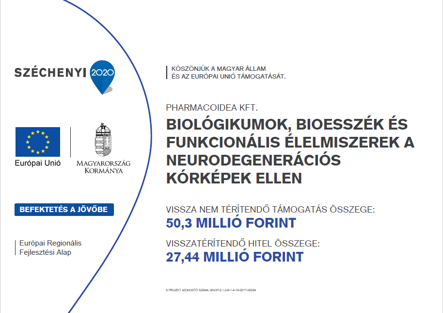 A világ vezető gyógyszergyárait partnerei közt tudó szegedi biotechnológiai vállalkozás, a Pharmacoidea Kft. a 2021. március 31-ével záródó, GINOP-2.1.2-8-1-4-16-2017-00234 azonosítójú projektje során új, a neurodegeneratív kórképek célmolekuláira specifikus bioesszéket, gyógyszerjelölteket, innovatív gyógyszertesztelési technológiákat és széles néprétegek egészségvédelmét szolgáló étrend-kiegészítőket hozott létre. A Széchenyi 2020 program keretében megvalósuló projekt több nemzetközi szabadalmat és rangos tudományos közleményeket is eredményezett, hozzájárulva az Európai Uniós támogatások felhasználásának átláthatóságához és az itthon megvalósuló biotechnológiai fejlesztések nemzetközi hírnevének öregbítéséhez. Az innovatív élettudományi fejlesztéseket a projekt során létrehozott közönségbarát internetes honlap-portfólió közvetíti a nagyközönség felé, ezzel is támogatva a magyar lakosság széleskörű egészségvédelmét. A projektnek köszönhetően a Pharmacoidea így tovább bővíthette gyógyszeripari fejlesztésekben hasznosuló technológiai portfólióját, hozzájárulva ezzel a cég árbevételének növeléséhez és új, tudásintenzív munkahelyek teremtéséhez. Az innovatív termékek és technológiák kifejlesztése mellett a projekt új gyógyszeripari és nemzetközi élettudományi együttműködéseket is megalapozott.